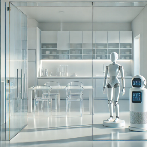 Prompt 3: Generate the entire house scene. Futuristic transparent house. Minimalism style. Smooth surface. all white. It is super Clean and organized with a white house front and backyard.